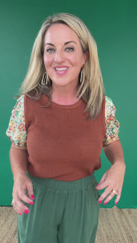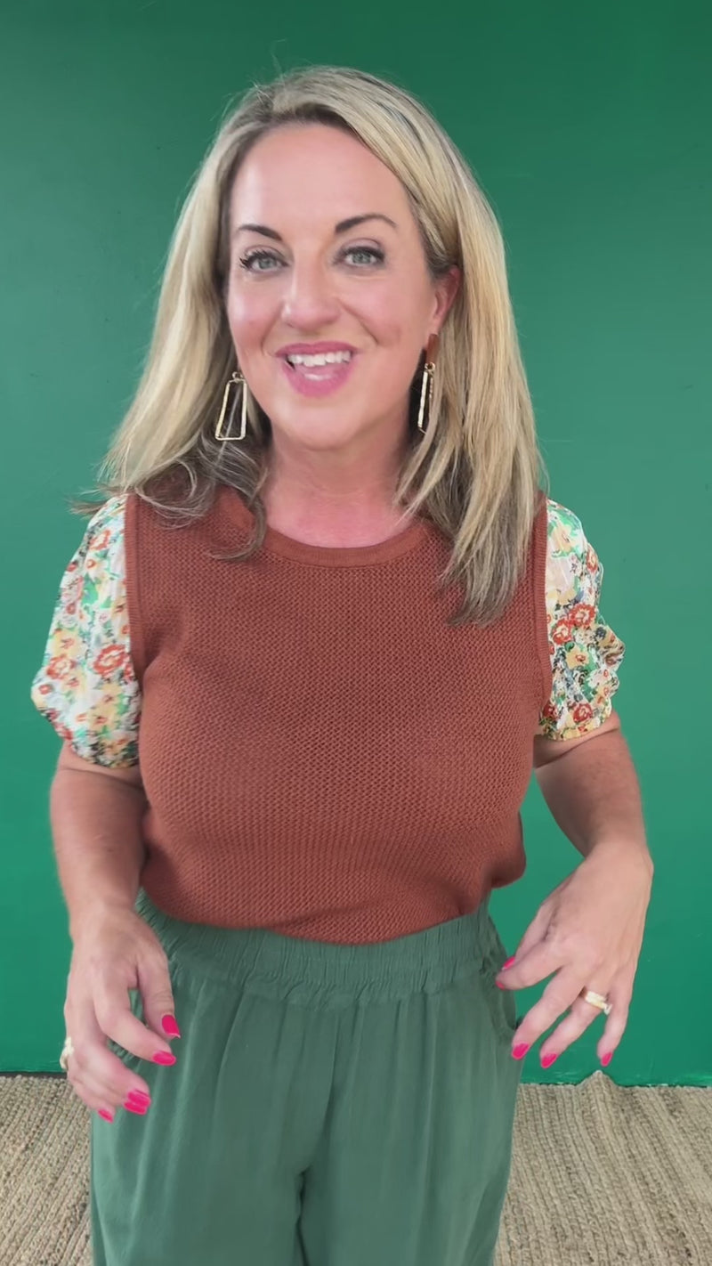 The Camilla Print Sleeve Knitted Blouse is a standout piece that blends cozy textures with feminine detail. The body is crafted from a soft, textured knit in a rich rust tone, offering both warmth and comfort while maintaining a lightweight feel perfect for fall. Its relaxed silhouette makes it easy to style, whether tucked into denim or paired with a flowy skirt. The short sleeves are designed in a contrasting printed woven fabric, showcasing a delicate floral pattern that adds a pop of color and visual interest. Finished with elastic sleeve openings, the sleeves have a subtle puff effect that balances the sweater’s casual knit body with a touch of romantic charm.