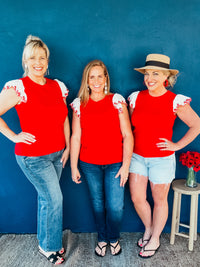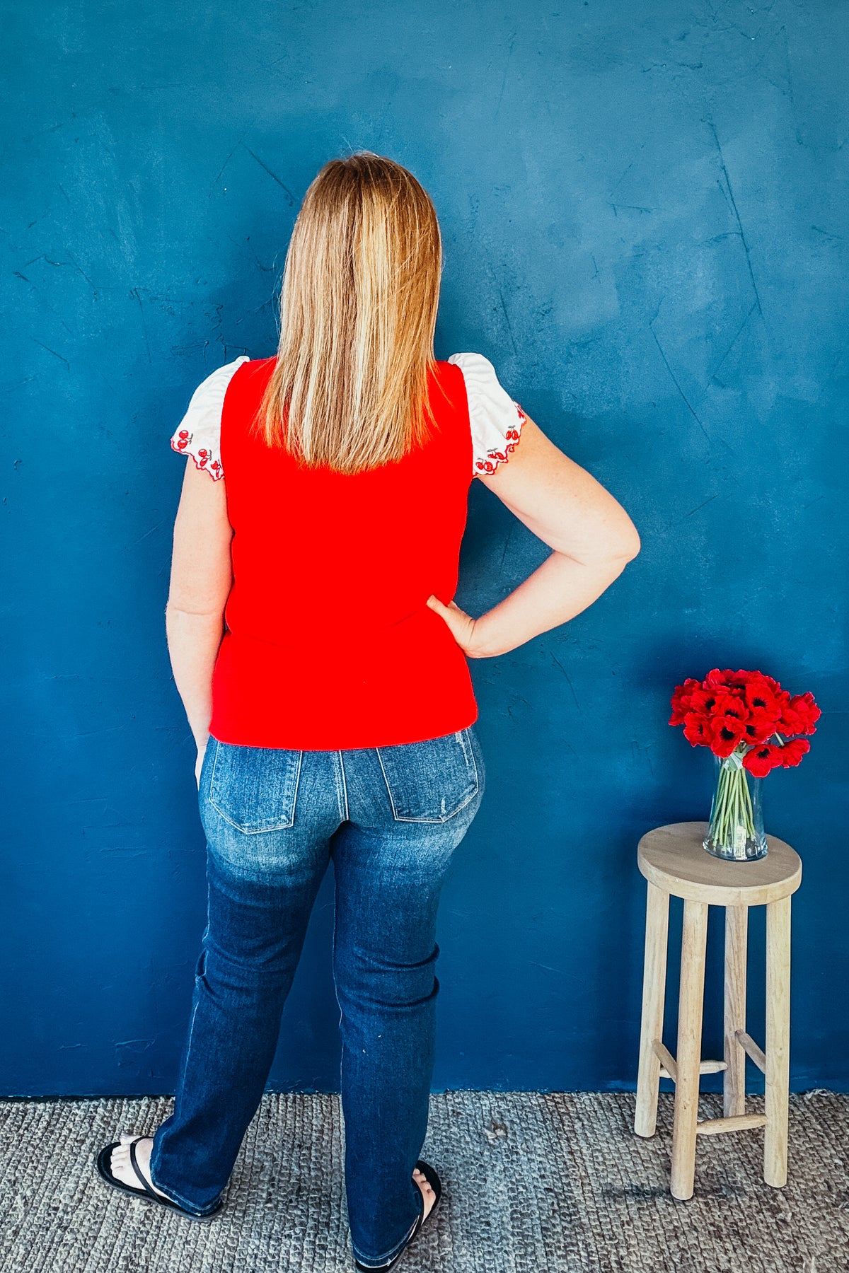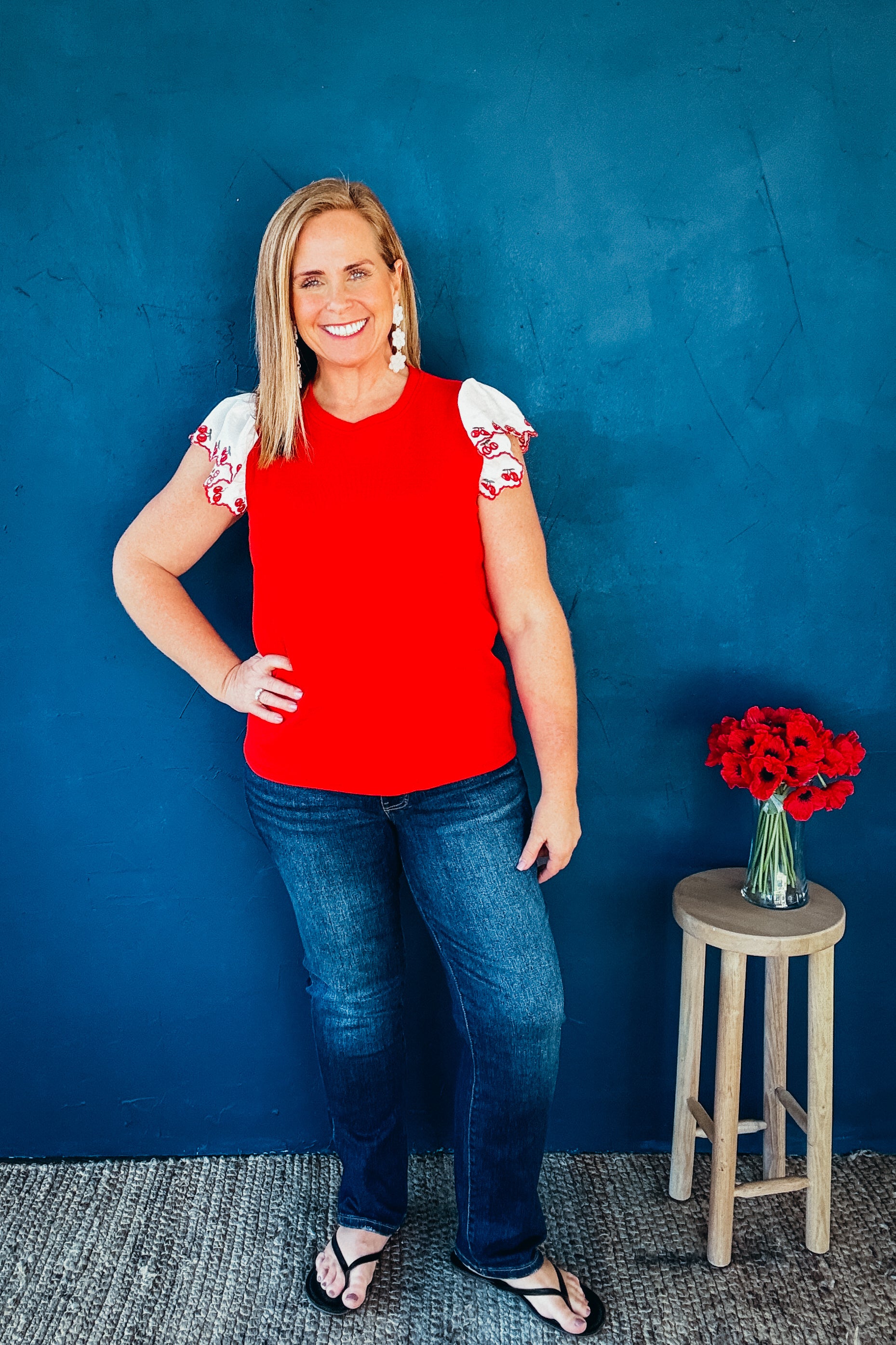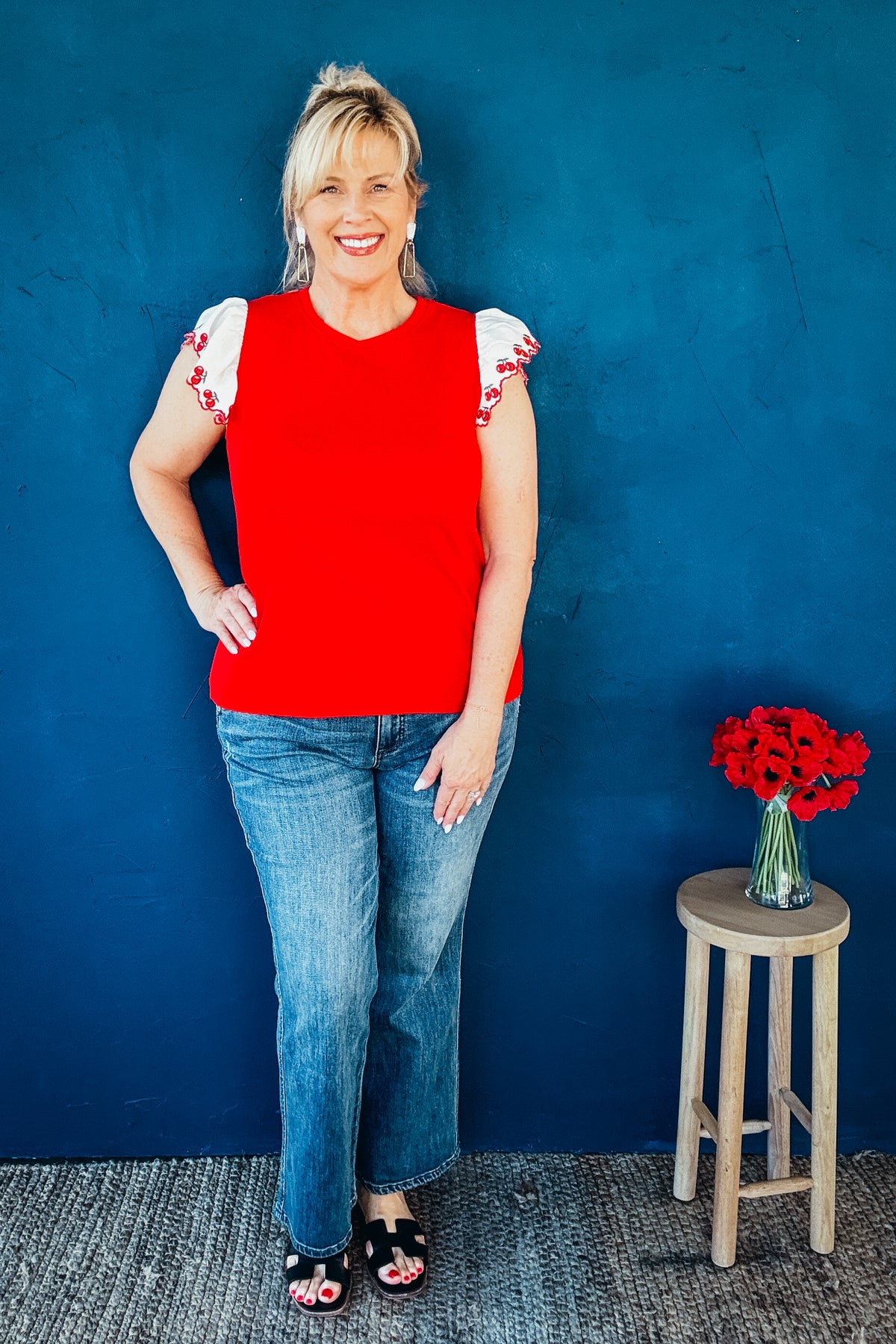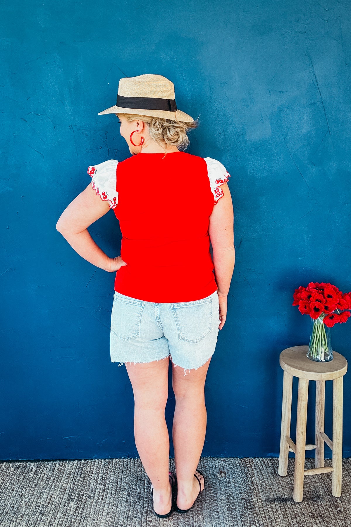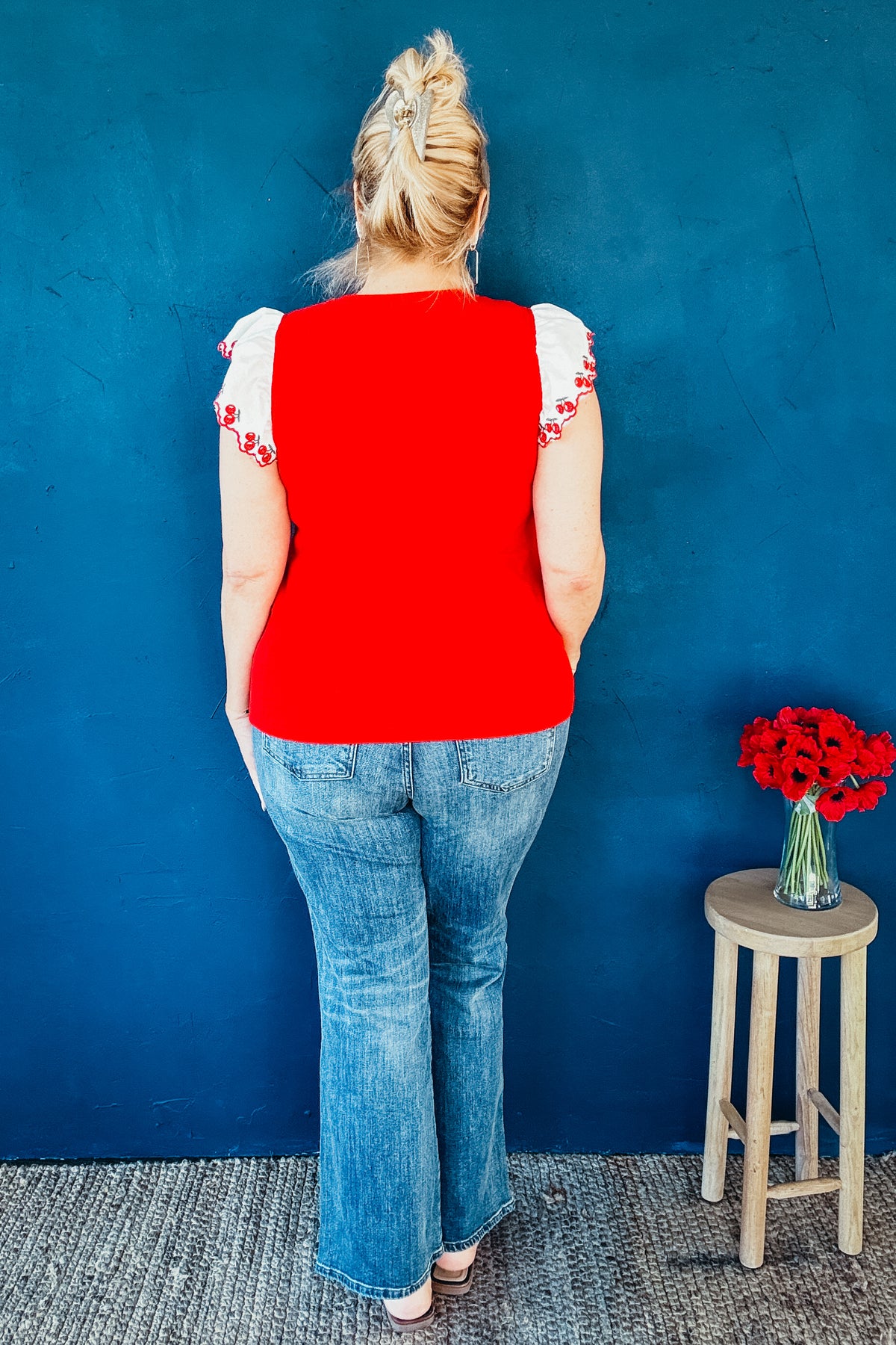 Sheree Cherry Embroidered Ruffle Sleeve Top in Red