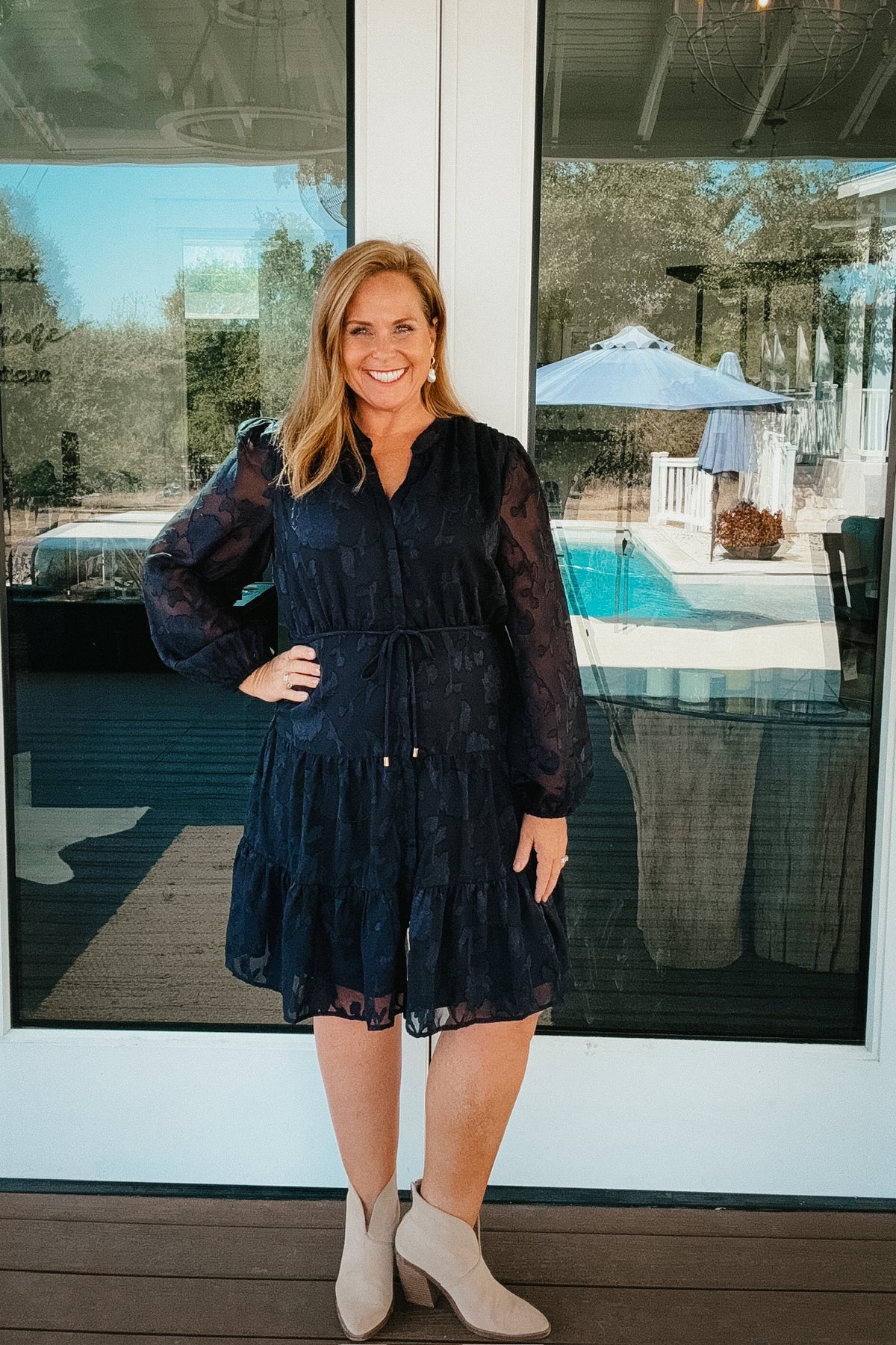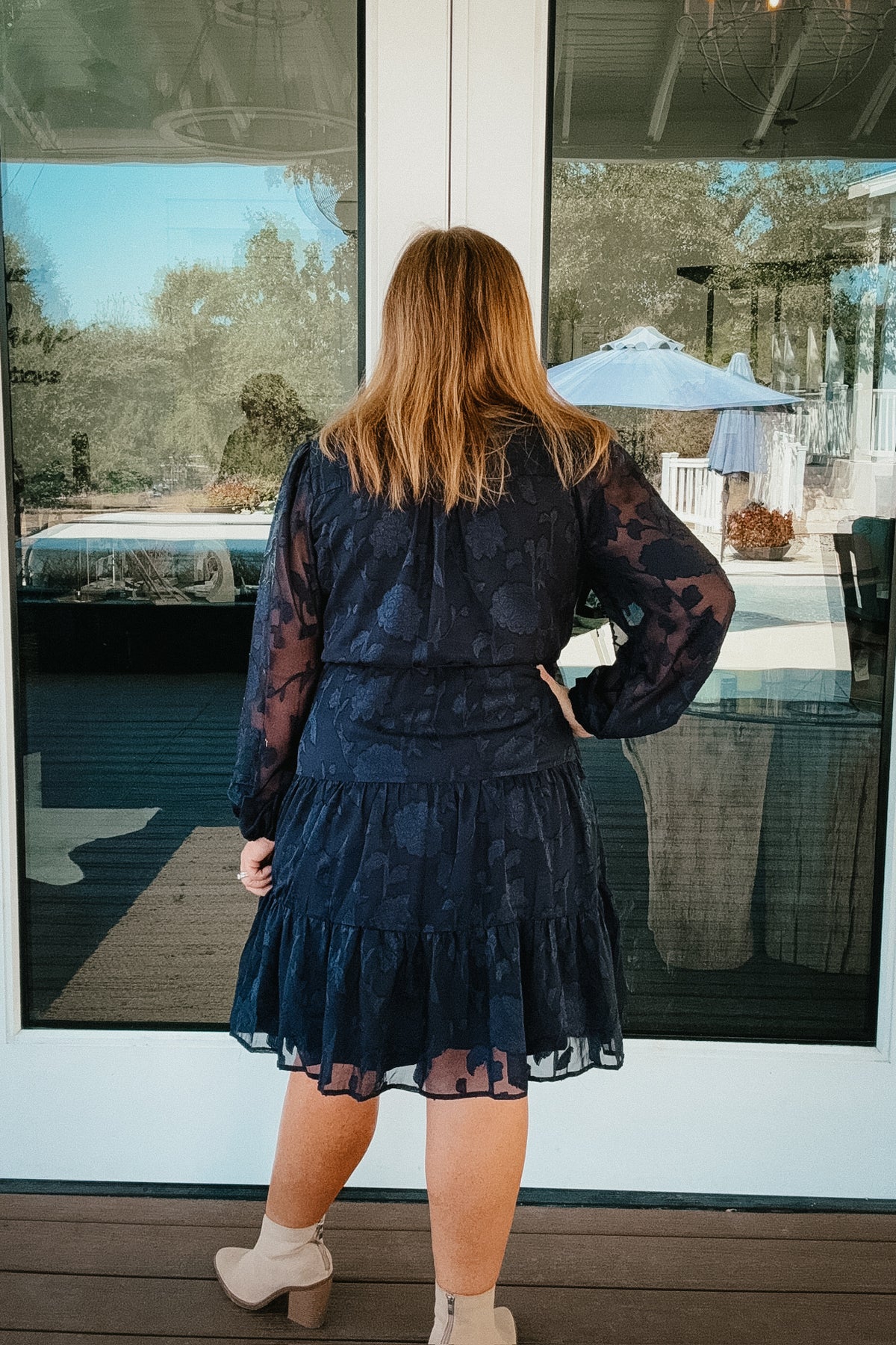 This dress is the perfect dress for upcoming Fall weddings, family pictures for Fall or date night. It is fully lined and has chiffon sleeves. The bodice has an elastic waist so it makes it nice and comfortable too.