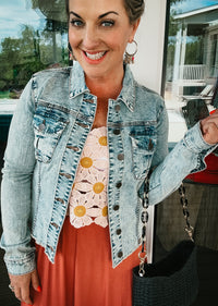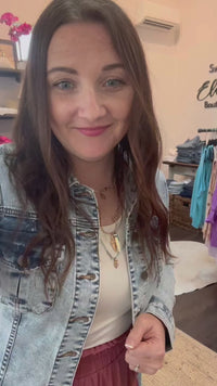 Stonewashed denim never looked better than this stretch-kissed denim jacket detailed with a wispy fringe hem. This jacket adds the style your Spring and Summer wardrobe need.