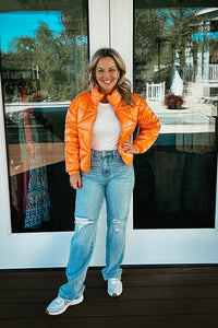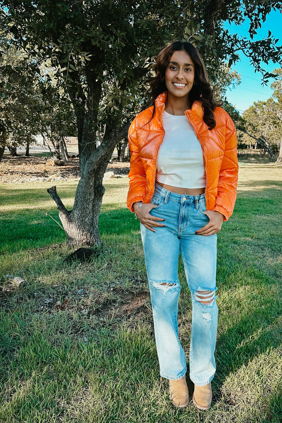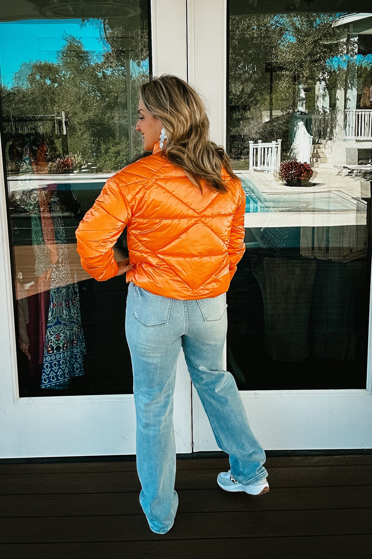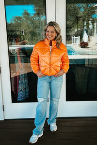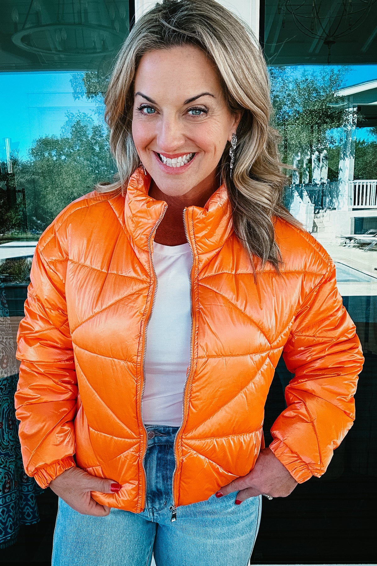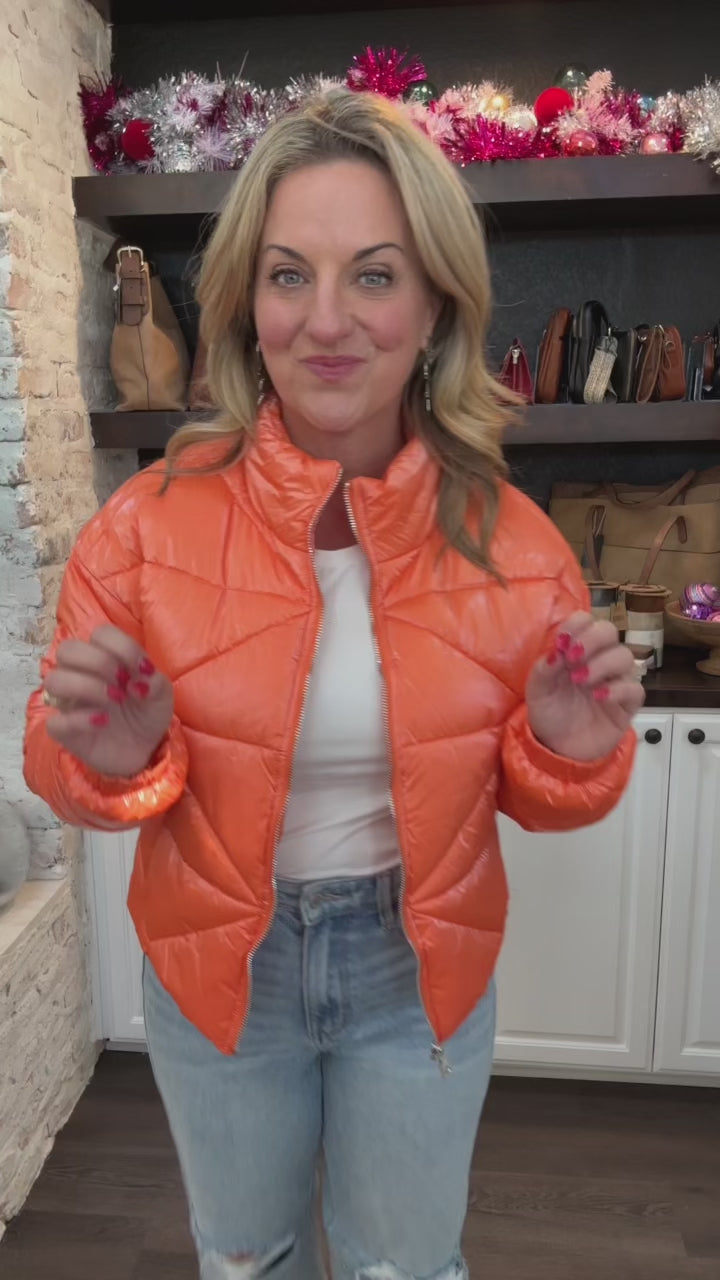 Short and oversized down jacket that will be on your wish list for the holiday season. The quality is outstanding and the material has an iridescent look to it making it so much fun.