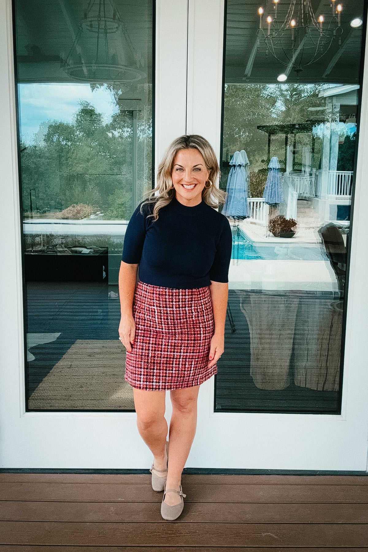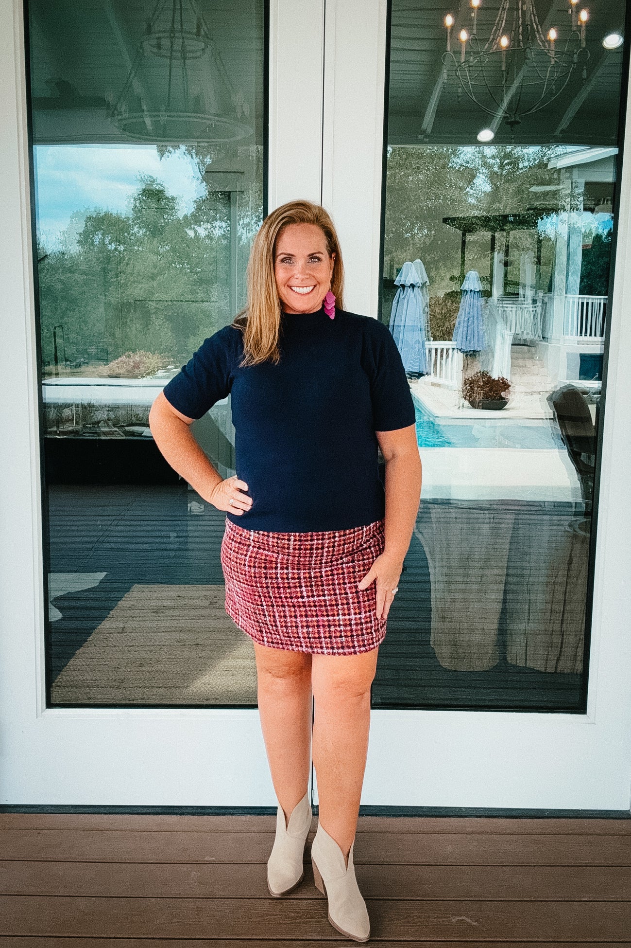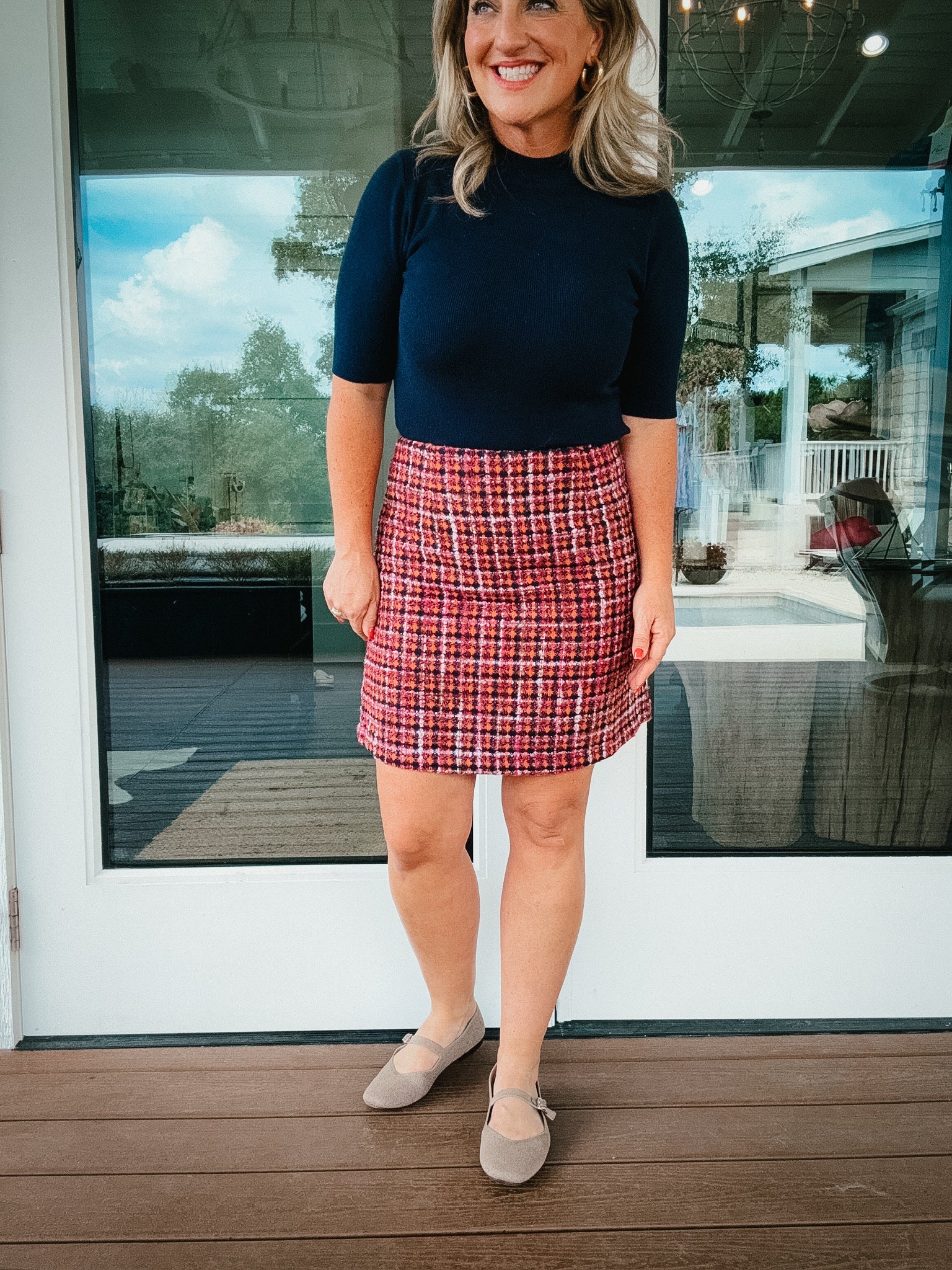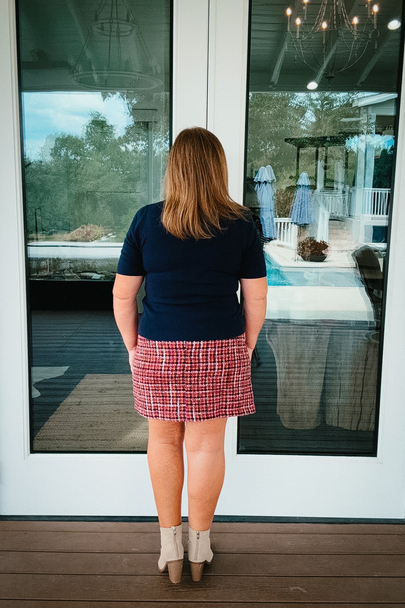 This pink and navy blue tweed skirt is what Fall Preppy dreams are made of. This skirt is easily worn to the office or wear it on the weekend. As the weather gets cooler, add a great pair of boots too! You will love it. The backside has a zipper. Skirt has no stretch.