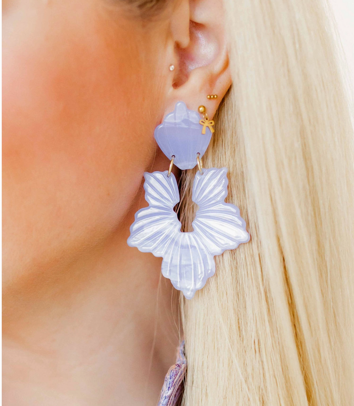 Add a touch of elegance to your accessory collection with the Michelle Statement Earrings in Lavender Haze. These 75mm shell-inspired earrings feature a bright purple, periwinkle colorway with an iridescent hue, creating a sophisticated and captivating look. Crafted from 100% surgical-grade stainless steel and eco-friendly acetate, they are lightweight, durable, and hypoallergenic, ensuring comfort for sensitive ears. As with all LINNY CO jewelry, these earrings are free from copper and nickel.