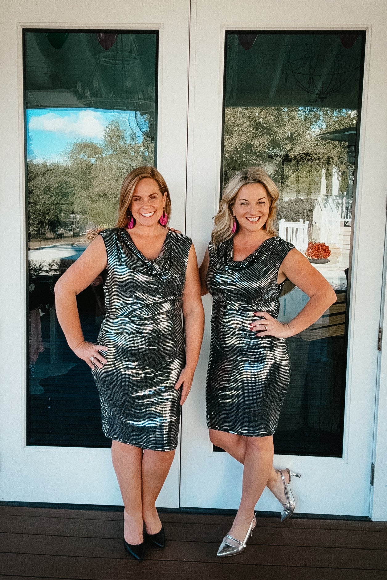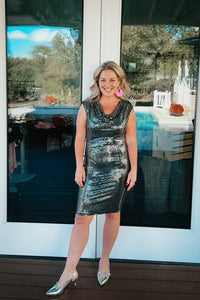 This sheath dress is what New Year's Eve is all about! This beauty has mirrored pieces all over it and we are so in love. This dress is lined and is stretchy, but it is fitted.