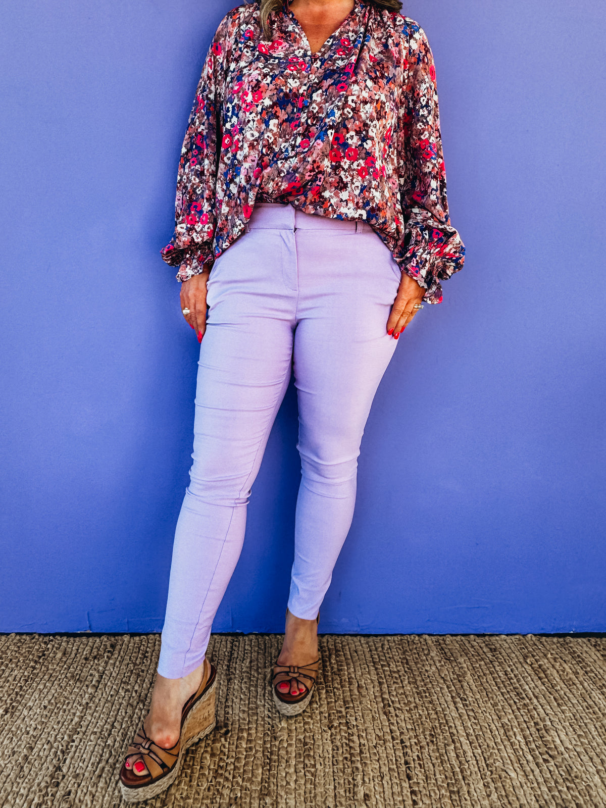 The Sadie Slim Fit Trousers from Dazz are designed to let you mix, match and add your own personal style. These lavender flat-front pants are perfect for morning meetings to evening events, and everything in between. On-seam pockets at the front and non-functional horizontal welt pockets at the back. They contain belt loops, a zipper and invisible button and two hook-and-bar closures. These are tight and stretchy and run small so you may need to size up one size. Please check the size chart for guidance on appropriate sizing.