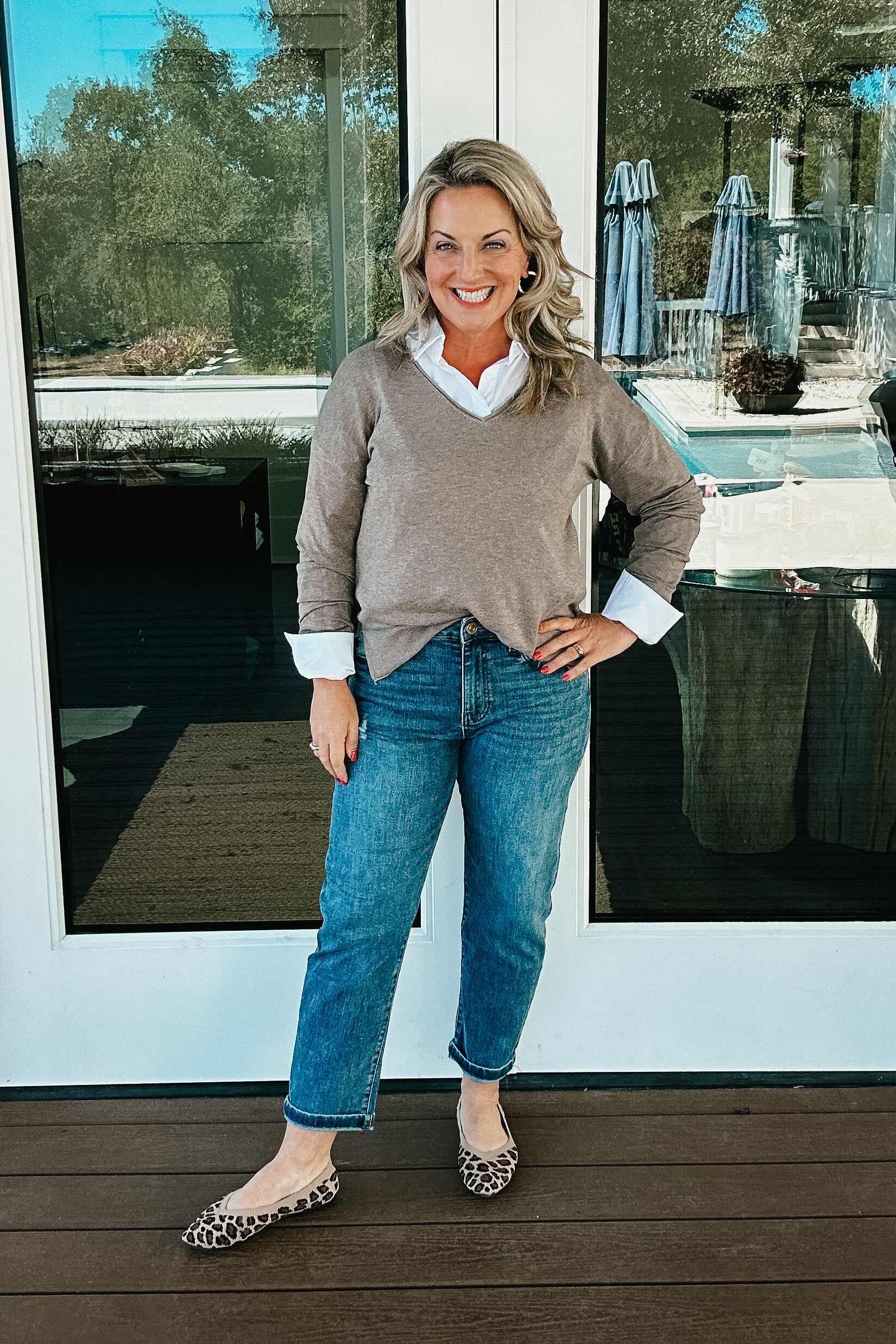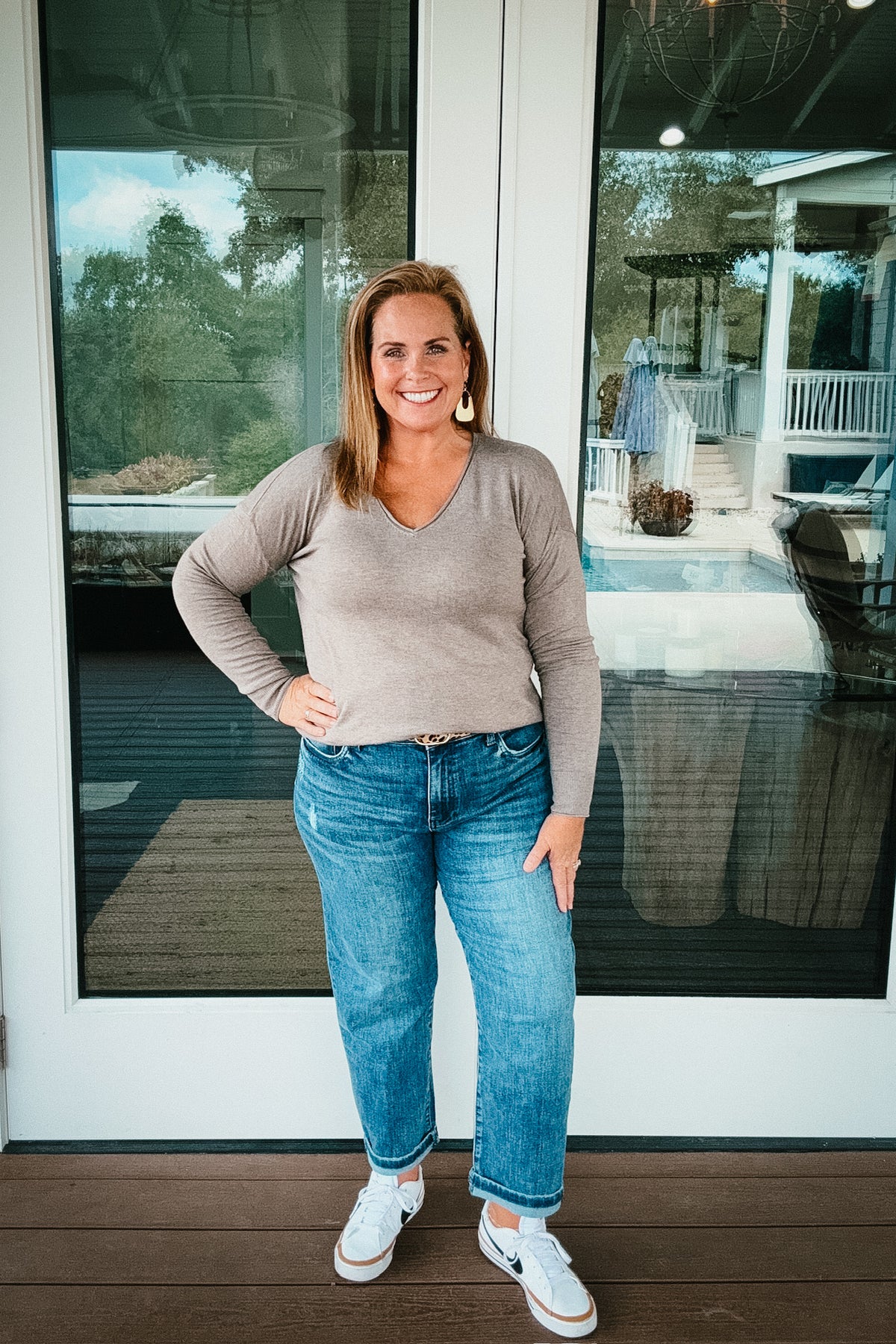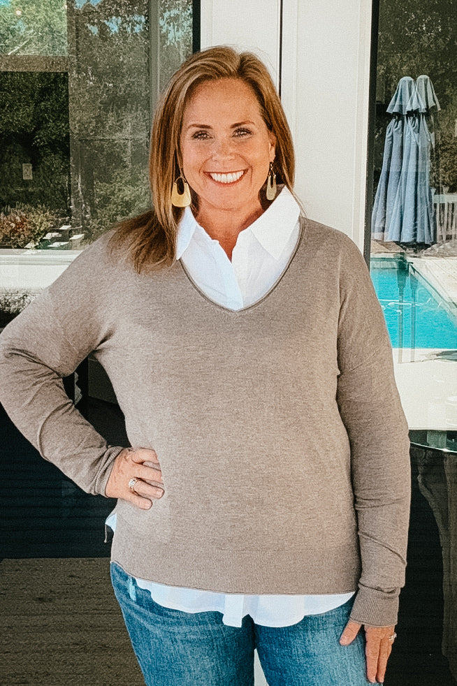 This casual, lightweight sweater will be your go to this season. It features a relaxed fit with a v neck and a dropped shoulder. The sweater is nice and lightweight and can be worn alone or with the Meredith Button Down blouse. Throw it on with jeans or even work pants and you'll sport your preppy style beautifully.